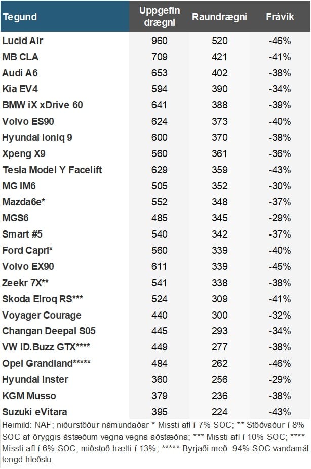 Aðeins Lucid Air var með meira frávik (46 prósent), en það skýrist af því að sá bandaríski hafði einnig keyrt langlengst í bitandi kulda, um 30 gráðu frosti.