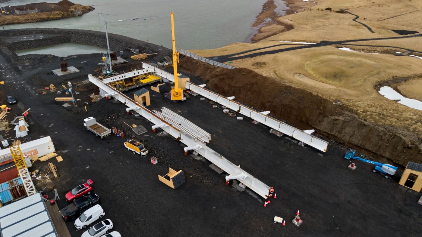 Í þessu fyrsta skipi komu um helmingur af þeim bitum sem notaðir verða í burðargrind brúarinnar. Allir bitarnir eru komnir á verkstað og hafin er vinna við að stilla þeim upp fyrir samsetningu.