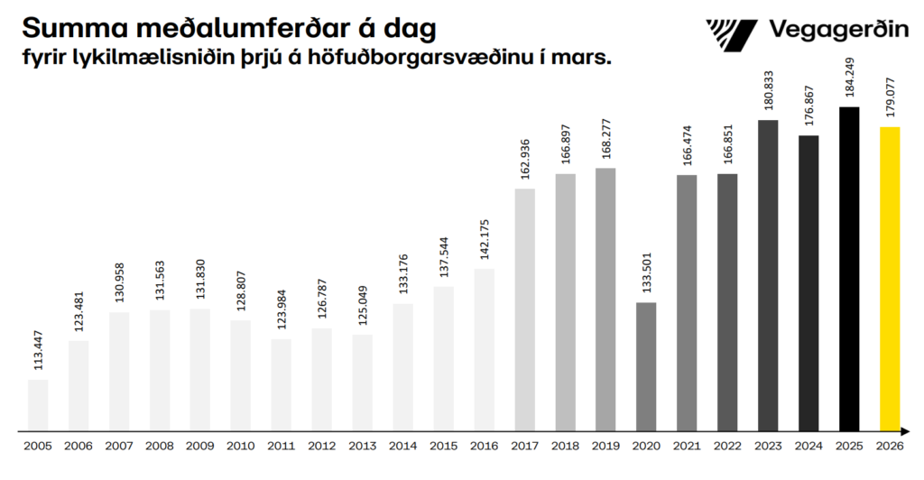 Talsverður samdráttur varð í umferð á höfuðborgarsvæðinu, í mars miðað við sama mánuð á síðasta ári ef marka má þrjú lykil mælisnið Vegagerðarinnar á höfuðborgarsvæðinu. Alls mældist um 2,8% samdráttur, fyrir mælisniðin þrjú. Þetta er í takt við það sem gerðist á Hringvegi en er þó heldur minni samdráttur.