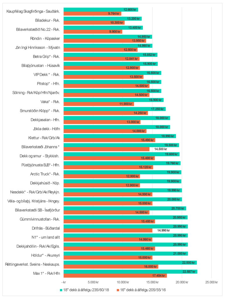 Dýrust var 16 tommu umfelgunin hjá Max1, 17.454 kr. Max1 var einnig með hæsta verðið fyrir umfelgun og jafnvægisstillingu á fjórum 18 tommu álfelgum, 22.587 kr.