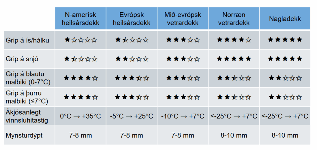 Í lok þessarar greinar má finna einfaldaða töflu sem ber saman eiginleika mismunandi dekkja við vetraraðstæður.